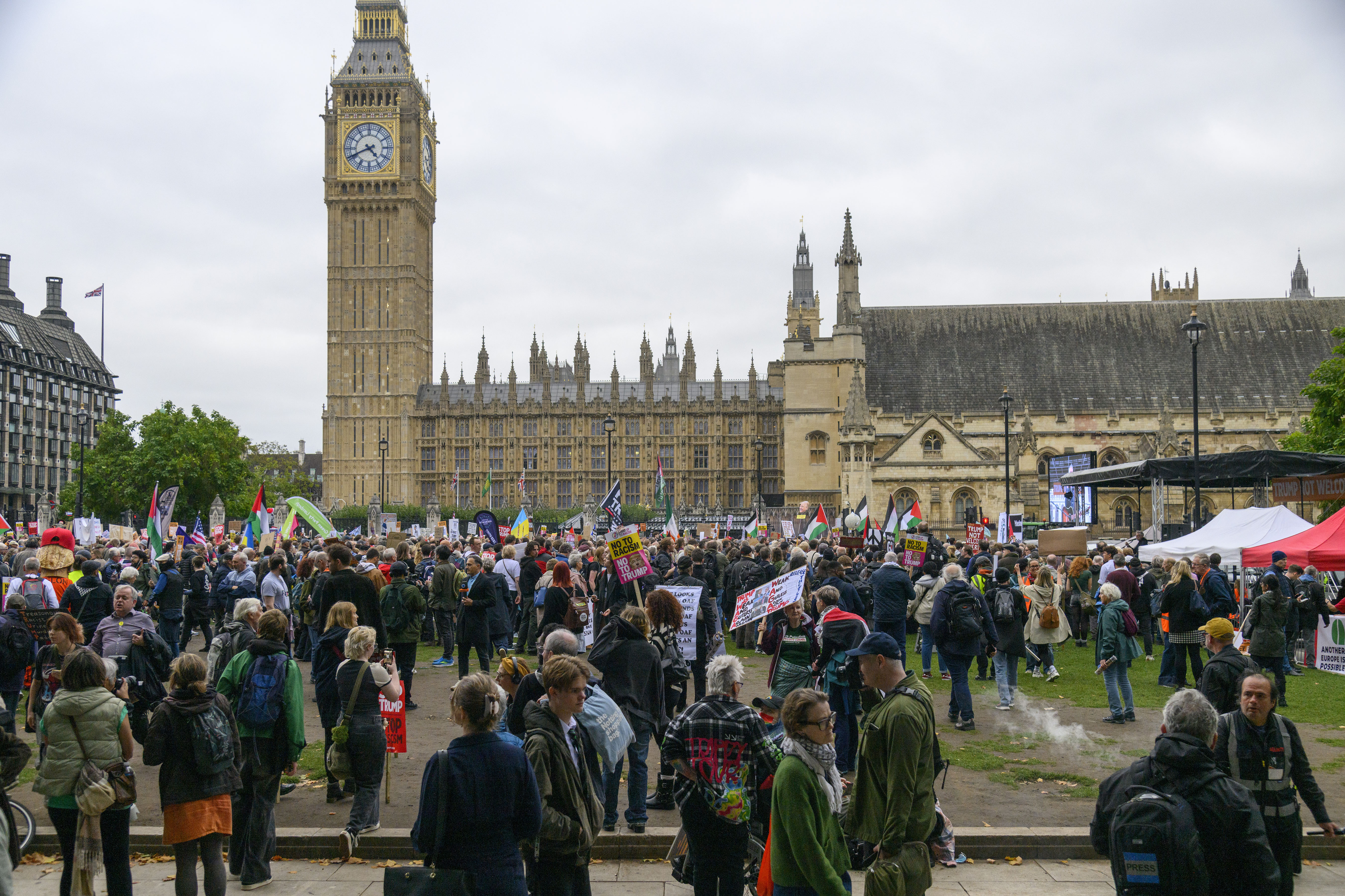 9月17日,抗议者在英国伦敦市中心手持标语抗议美国总统特朗普访英。新华社发(雷伊·唐摄)