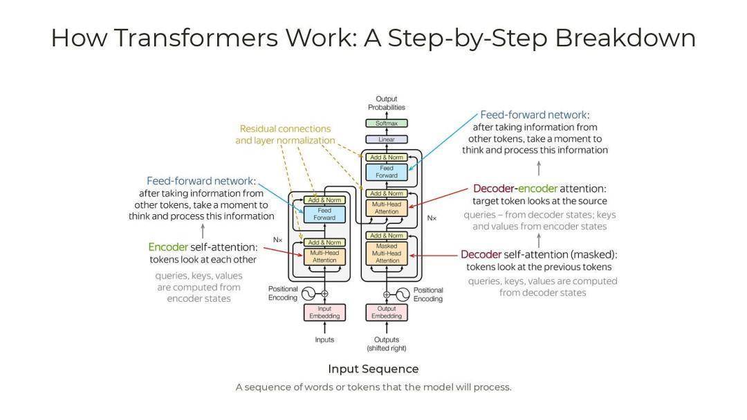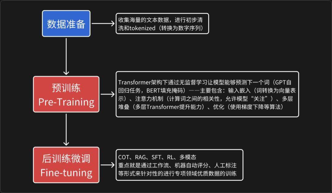关键转折点:神经网络的兴起。20世纪80-90年代,递归神经网络(RNN)和长短期记忆网络(LSTM)的出现允许模型处理序列数据,但在长序列上易出现梯度消失的问题,导致很难去训练大规模模型。Transformer架构的诞生(2017年):这是LLM形成的里程碑。Google研究团队在论文《Attention Is All You Need》提出,Transformer取代了RNN,使用自注意力机制(Self-Attention)来并行处理序列提高效率和性能。在此基础上就使得模型能够处理更长的上下文,并能捕捉词与词之间的复杂关系。早期LLM如BERT(Google于2018研发)和GPT-1(OpenAI于2018开发)就是基于Transformer的变体。