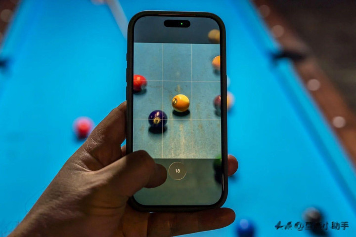 (一只手握着智能手机,正在拍摄蓝色台球桌上台球的特写,手机屏幕上显示的台球清晰对焦,而实际的台球桌背景则处于模糊状态。)