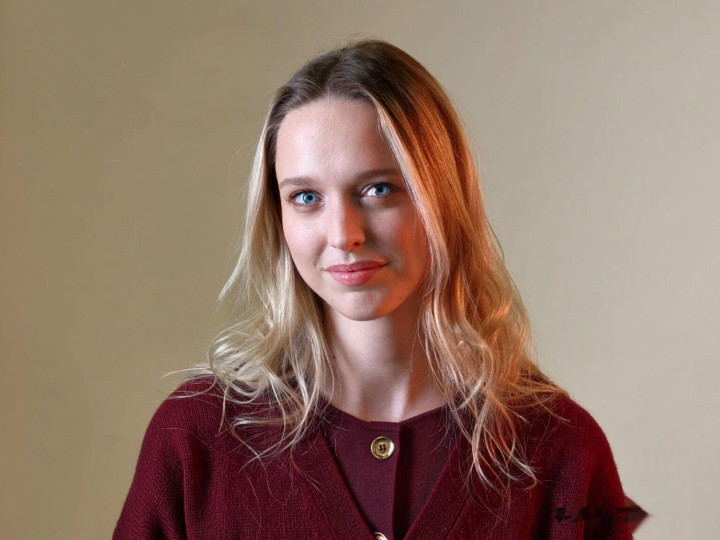 (一位皮肤白皙、金发长发的年轻女性,身穿栗色毛衣,在纯色米色背景前温柔微笑着看向镜头。)