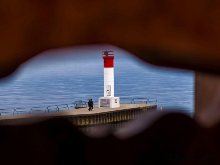 (码头上,一个人坐在红白相间的灯塔旁,前景为模糊的不规则框架,背景是平静的蓝色水面。)