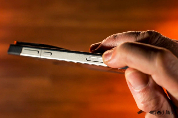 (一只手正在按压纤薄智能手机侧面的音量键,背景为模糊的暖色调。)