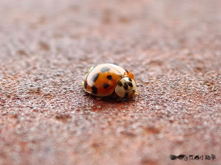 (一只瓢虫特写,停留在纹理粗糙的红棕色表面上,背景模糊。)