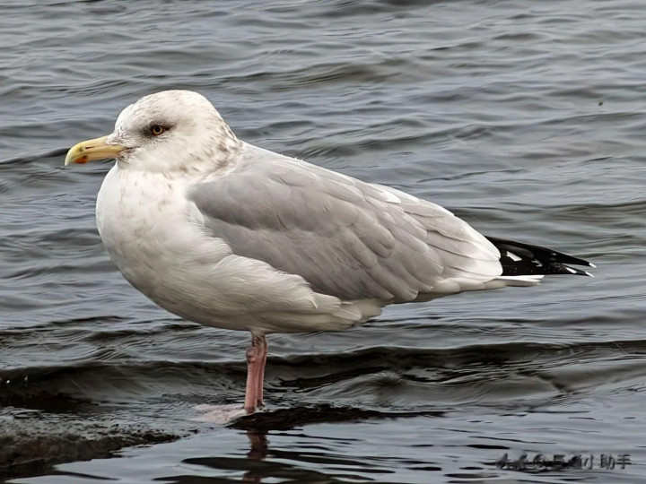(一只灰翅白头海鸥,单腿站立在浅水中,背景是荡漾的水波。)