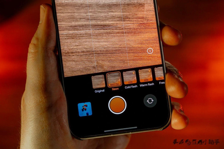 (一只手握着智能手机,屏幕显示相机应用的滤镜界面,通过相机可看到木质表面,界面上有“原图”“霓虹”等滤镜选项及闪光灯设置。)